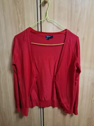 Chaqueta de punto fina en color rojo. Es una prenda versátil y cómoda. - Cierre de botones. - Diseño abierto. - Manga larga.