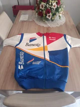 Chaqueta de ciclismo vintage de la marca Banesto, con diseño Nalini Campagnolo. - Color principal azul con detalles en blanco, rojo y amarillo. - Cierre de cremallera frontal. - Logo de Banesto en el pecho y en la manga. - Inscripción Asociación Deportiva Banesto en la parte frontal.