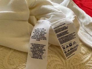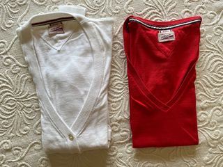 Conjunto de dos prendas de vestir. - Chaqueta de punto blanca con cuello en V y un botón. - Camiseta roja de manga corta con cuello en V.