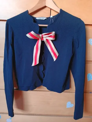 Chaqueta de punto Naf Naf con un bonito detalle de lazo. - Diseño con cuello festoneado. - Lazos a rayas rojas y beige. - Manga larga. Preciosa