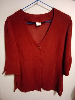 Chaqueta de lino de color rojo. - Cuello en V. - Cierre de un botón. - Manga 3/4 con abertura. - Bajo con aberturas laterales. Preguntar medidas pantalón talla 48