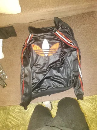 Chaqueta deportiva Adidas con detalles llamativos. - Diseño con las icónicas tres rayas en las mangas. - Combinación de colores negro y detalles en rojo y plateado. - Cierre frontal con cremallera. - Forro interior - Usada 3 veces