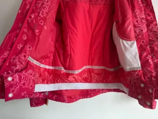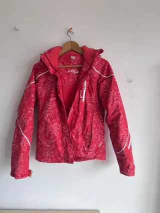 Chaqueta de esquí acolchada roja, talla M. Modelo ajustado con detalle de cinturón en la cintura. Capucha y cuello con forro de pelo muy agradable. Aislante térmico e impermeable, resistente al agua y al frío. En muy buen estado, usada muy poco. Su precio original era de 150€.
