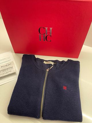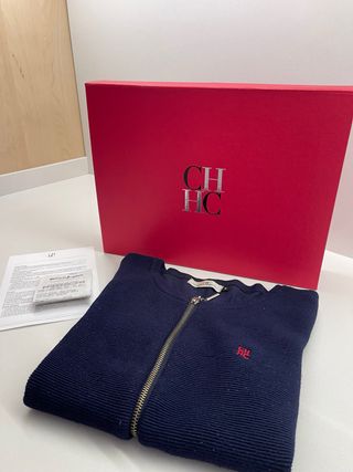 Chaqueta de punto de la marca Carolina Herrera en color rojo. Presenta un diseño con cuello alto y cierre de cremallera. Talla XL - Bordado CH en la parte delante - Cierre de cremallera.