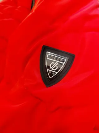 Chaqueta deportiva de color rojo, ideal para actividades al aire libre. - Diseño ligero y funcional. - Cremallera frontal completa. - Escudo del equipo en el pecho.