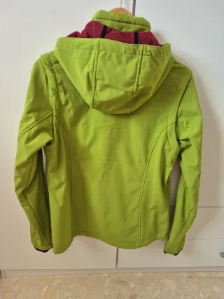 Chaqueta CMP de mujer, ideal para actividades al aire libre. Su diseño combina funcionalidad y estilo. - Color verde vibrante con detalles en rojo. - Capucha integrada. - Cremalleras en contraste. Aislante, transpirable, impermeable y cortavientos