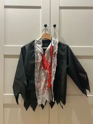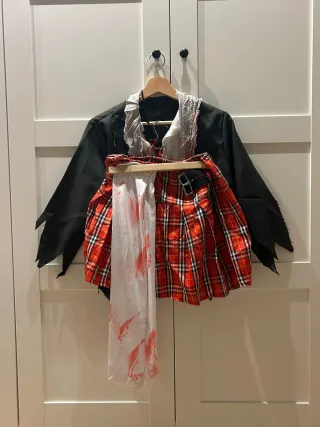 Conjunto de disfraz de colegiala con temática zombi. - Chaqueta negra con roturas y aspecto desgastado. - Falda de cuadros escoceses en rojo y negro. - Tiras de tela blanca con manchas rojas simulando sangre.