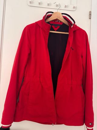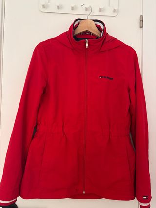 Chaqueta de la marca Tommy Hilfiger en color rojo. - Cuello con detalles de rayas. - Logo de la marca en el pecho. - Cintura elástica. - Puños con detalles de rayas. Con capucha escondida, perfecta para temporal de lluvia o viento