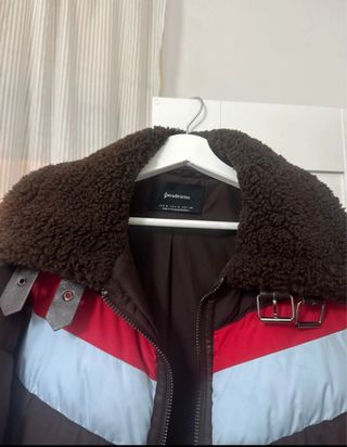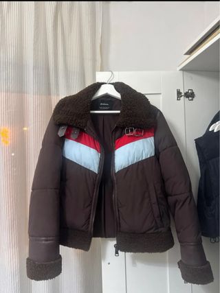 Chaqueta de Stradivarius con un diseño moderno y llamativo. - Cuello de pelo sintético. - Paneles en contraste de color rojo y azul claro. - Puños y bajo con detalle de pelo sintético. - Cierre de cremallera frontal.