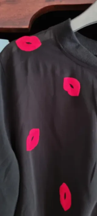 Preciosa chaqueta roja y vestido negro bordados, ideales para una ocasión especial. La chaqueta es de un tejido ligero y fluido, con un diseño de volantes en el cuello y las mangas. El vestido tiene un diseño elegante y sofisticado, con detalles bordados. - Chaqueta roja de gasa. - Vestido negro con bordados. - Perfecto para eventos especiales.
