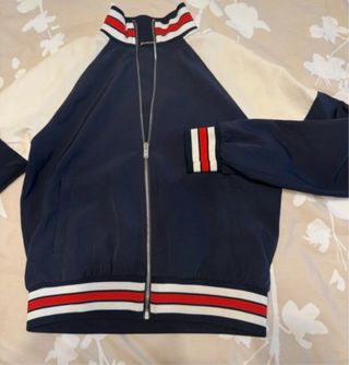 Chaqueta estilo bomber de Stradivarius en talla S. Combina el azul marino con detalles en blanco y rojo en cuello, puños y bajo. - Cierre de cremallera. - Cuello alto con ribetes. - Puños y bajo elásticos con rayas.