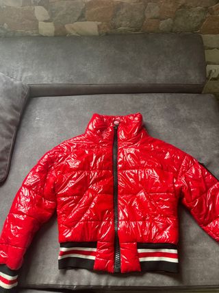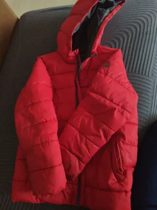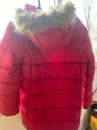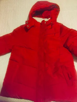 Chaqueta infantil de color rojo, ideal para el frío. Cuenta con una capucha forrada de pelo sintético. Fue usada pero esta en buen estado. Talla 5-6 años
