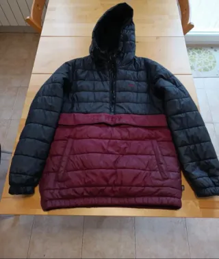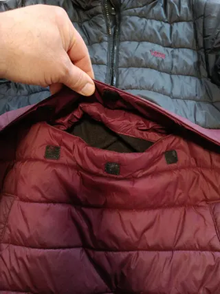 Chaqueta de invierno de la marca Vans, con un diseño bicolor. - Talla S muy ligera 500g. - Parte superior en color negro. - Parte inferior en color rojo burdeos. - Capucha integrada. - Bolsillo frontal tipo canguro. - mira mí perfil tengo más cositas. - Está usada y tiene parches en las mangas, perfectas para niños. - carhartt - northface - snowboard - rab.