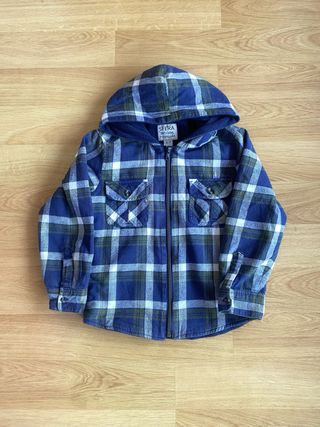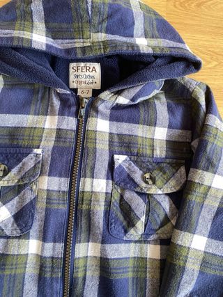 Chaqueta de niño 🧒 tipo camisa leñadora en cuadros azul marino, rojo y blanco. Diseño con capucha y forro polar interior, cálida y cómoda. Dos bolsillos frontales con cierre de botón estilo camisa. 👕 Detalles: • Tipo: chaqueta tipo camisa / leñadora • Marca: SFERA (Esfera) • Talla: M (niño) • Equivalencia: 6–7 años • Color: azul marino, rojo y blanco • Cierre: botones • Detalles: dos bolsillos frontales con botón, capucha • Interior: forro polar • Estilo: casual / niño • Estado: muy buen estado, sin defectos visibles ✨ ⚡ Ideal para: entretiempo 🌤️, invierno suave ❄️ o uso diario con abrigo 🧢. 🔎 Palabras clave: chaqueta niño, camisa