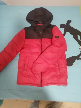 Chaqueta acolchada con diseño bicolor y capucha. Talla 164 - Parte superior negra. - Parte inferior y mangas rojas. - Cierre de cremallera frontal. - Bolsillos laterales. - Capucha integrada.