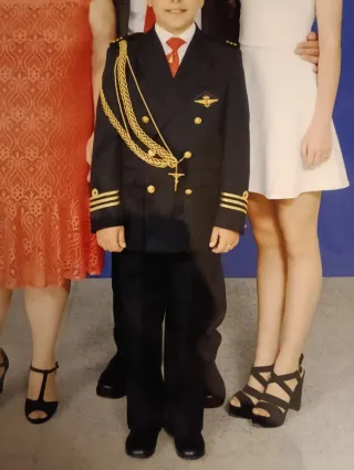 Traje de comunión para niño con diseño de almirante. Se encuentra en muy buen estado. Talla 11 años. - Chaqueta azul marino con detalles dorados. - Pantalón a juego. - Corbata roja. - Adorno de cadena dorada. - Cruz decorativa.