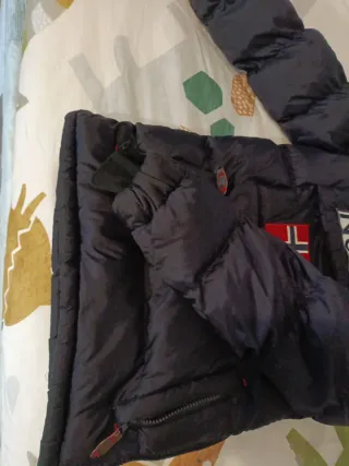 Chaqueta de invierno para niño. - Diseño acolchado. - Capucha con pelo. - Bolsillo frontal con parche de la bandera de Noruega. - Cremalleras y detalles en rojo.