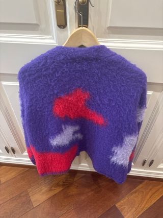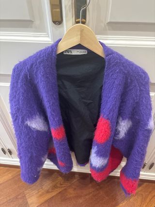 Chaqueta de punto con un diseño llamativo y textura suave. - Diseño de rayas y manchas en colores morado, rojo y blanco. - Corte abierto y mangas largas. - Tejido mullido y agradable al tacto.