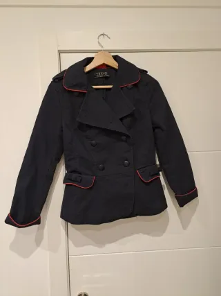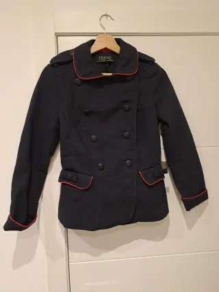 Chaqueta estilo militar de TRF (Zara) en color azul marino con detalles en rojo y doble botonadura. Diseño original y juvenil, perfecta para looks casuales o urbanos. Talla M Color azul marino con detalles rojos Cierre de botones estilo militar Tejido cómodo y fácil de combinar Buen estado general