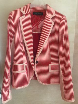 Chaqueta de señora. Marca Zara. Talla M. Muy poco uso. De rayas rojas y cambio de estampado en las mangas y en los laterales de la chaqueta. No envío. Más en mi perfil.
