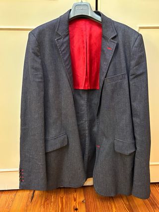 Chaqueta de vestir de la marca El Ganso, en color gris y talla M. En perfecto estado. Tiene una pequeña mancha en la codera. - Forro interior rojo. - Cierre de dos botones. - Bolsillos frontales. - Puños con detalle de botones.