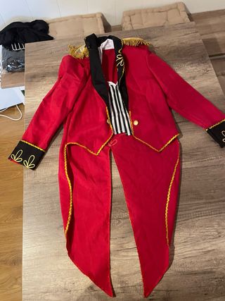 Disfraz de presentador de circo con detalles llamativos. - Chaqueta roja con solapas negras y adornos dorados. - Chaleco a rayas blancas y negras. - Pantalón rojo con detalles dorados.