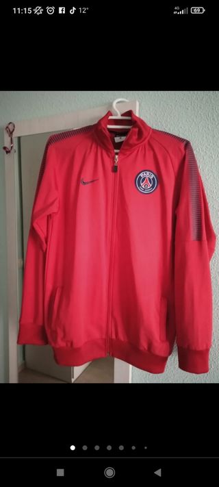 Chaqueta deportiva roja, talla xs, logo equipo futbol París Saint Germain, roja con detalles en azul, como nueva, puesta sólo un par de veces.