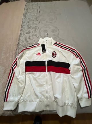 Chaqueta deportiva estilo retro del AC Milan. - Diseño con franjas icónicas en mangas. - Escudo del equipo y logo de Adidas. - Cremallera frontal completa.