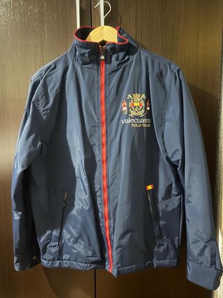 Chaqueta de estilo deportivo con detalles en rojo. - Cierre de cremallera frontal. - Bolsillos laterales con cremallera. - Escudo bordado en el pecho. - Detalle de la bandera española en la manga.