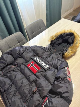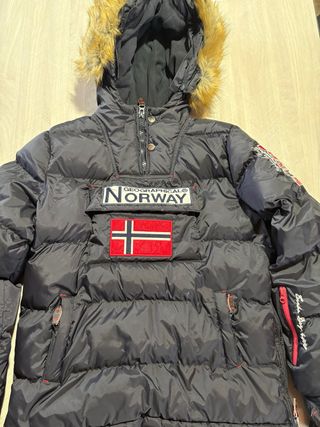Chaqueta Geographical Norway con detalles en rojo. - Capucha con pelo. - Bolsillo frontal. - Cierre de cremallera y botones. - Parche de la bandera de Noruega.