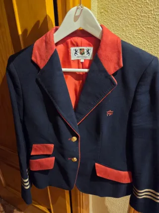 Elegante chaqueta de la marca Montepicaza. - Diseño clásico en azul marino. - Cuello y detalles en contraste de color rojo. - Botones dorados. - Logo bordado en el pecho. - Adornos en las mangas.