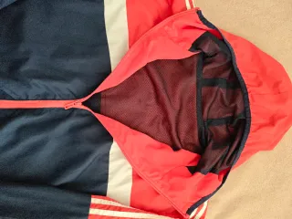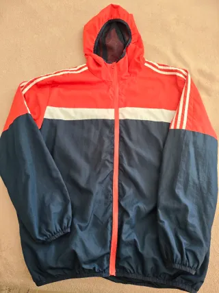 Chaqueta tipo universitaria impermeable en color rojo, blanco y azul en muy buen estado, con capucha, cremallera y bolsillos. Kelme by lefties, talla L.