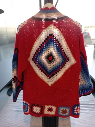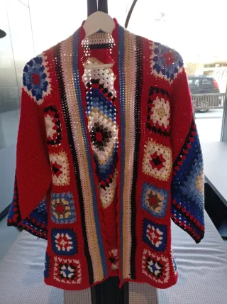 Chaqueta de diseño artesanal hecha a crochet, con un vibrante patrón multicolor y base roja. - Elaborada con técnica de granny squares. - Diseño abierto tipo kimono. - Mangas largas.