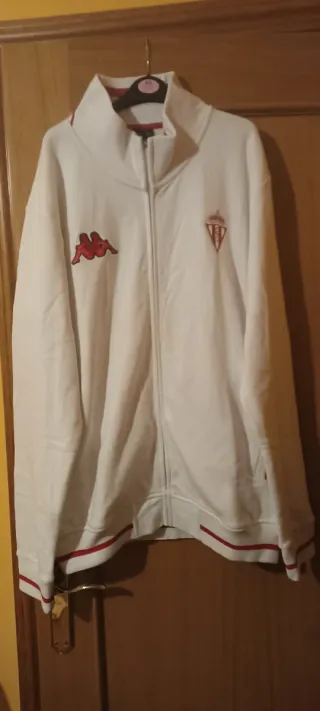 Chaqueta deportiva del Real Sporting de Gijón. - Diseño con cuello alto. - Logo de Kappa en el pecho. - Escudo del club en el pecho. - Puños y cintura elásticos con detalles en rojo. - Nueva con etiquetas. - Talla XXL