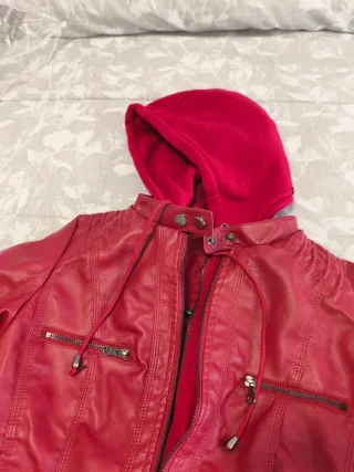 Nueva,sin estrenar. Capucha desmontable. Escucho ofertas Chaqueta de polipiel en color rojo, con un diseño moderno y detalles que la hacen única. - Cuello mao. - Cierre de cremallera. - Bolsillos frontales con cremallera. - Puños con cremallera y detalle plisado.