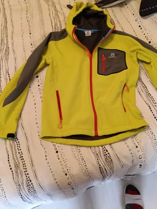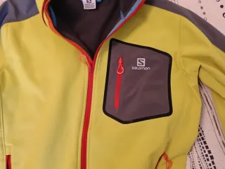 Chaqueta técnica Salomon con un diseño moderno y funcional. - Cremallera frontal con detalles en rojo y naranja. - Bolsillo en el pecho con cremallera. - Combinación de colores gris y amarillo vibrante. - Cuello con forro interior en contraste.