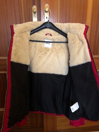 Chaqueta acolchada con capucha, muy calentita, ideal para el frío. - Cierre de cremallera frontal. - Bolsillos laterales con cremallera. - Forro interior rojo. - Sin estrenar, con etiquetas.