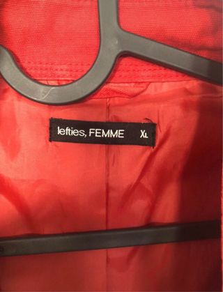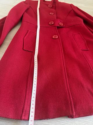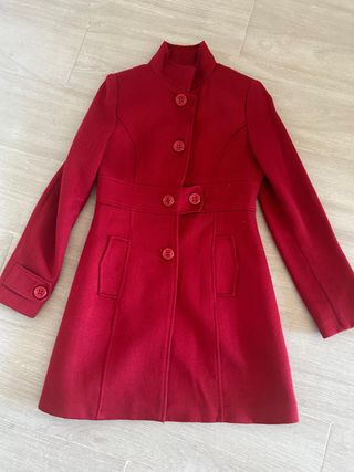 - Chaqueta tipo gabardina de color rojo brillo con un diseño de botones. - Es bastante ancha, con bolsillos y cierre de botones grandes. Está prácticamente nueva.