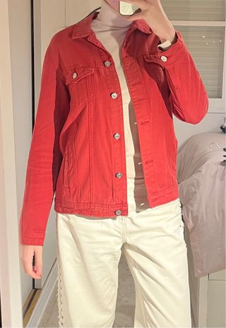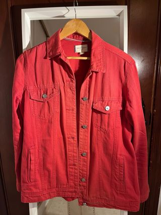 Cazadora vaquera de color rojo. - Cierre de botones metálicos. - Dos bolsillos en el pecho. - Cuello clásico.