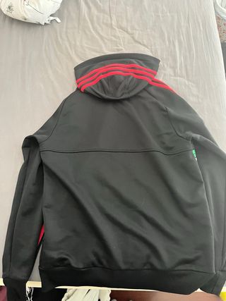Chaqueta deportiva del A.C. Milán con el diseño clásico de Adidas. - Diseño con franjas rojas en las mangas. - Escudo del equipo en el pecho. - Cierre de cremallera frontal.