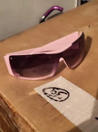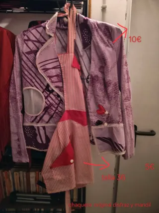 Conjunto de chaqueta de disfraz y mandil. - Chaqueta con estampado morado y detalles en blanco. - Mandil a rayas rosas con detalles rojos. - Talla 36. 18 € conjunto mandil. Chaqueta. Gafas y bandeja.