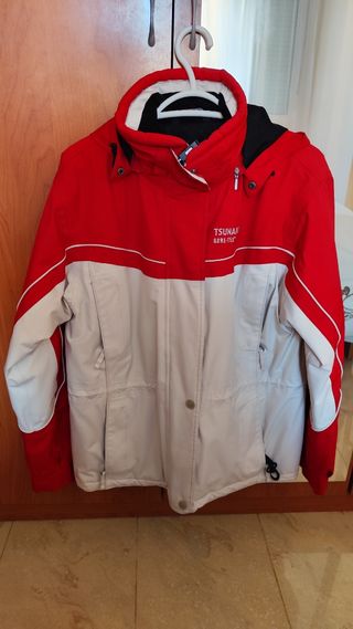 Chaqueta Tsunami para mujer, con un diseño bicolor en rojo y beige. - Cierre con cremallera, velcro y corchetes. - Bolsillos frontales e interiores. - Capucha desmontable por cremallera. - Tejido GORE-TEX. Está en perfecto estado. La usé para ir a esquiar varias veces, pero ahora me queda grande.