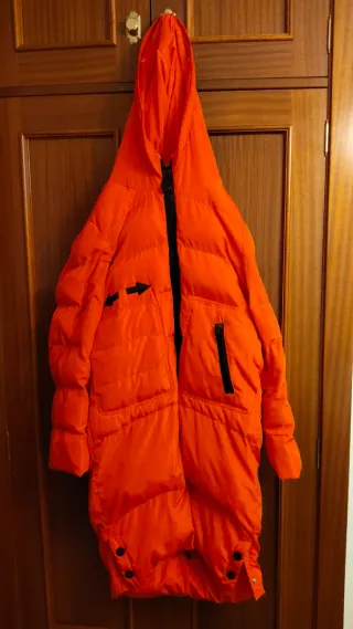 Chaqueta acolchada de color rojo con capucha. - Cierre frontal con cremallera. - Bolsillos con cremallera. - Detalle de flechas negras en el pecho. - Botones a presión en el bajo.