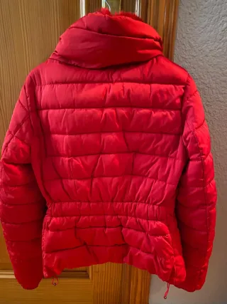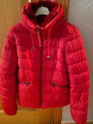 Chaqueta acolchada de color rojo, ideal para el frío. Cuenta con un diseño moderno y detalles que la hacen única. - Capucha con forro de pelo. - Cierre de cremallera. - Bolsillos laterales con cremallera. - Cordones ajustables en la capucha.