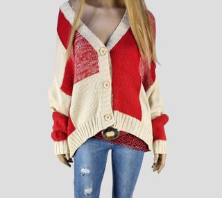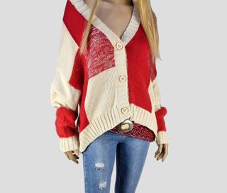 Chaqueta de punto con un diseño moderno y llamativo. - Combinación de colores beige y rojo. - Cuello en V. - Cierre de botones. - Mangas largas. Medidas - Talla única (Medido en Plano) Pecho/Cintura: 74 cm - 29.13'' Largo: 65 cm - 25.59'' Material 92% Acrylic, 8% Nylon Made in Italy (Los accesorios no están incluidos en la venta)