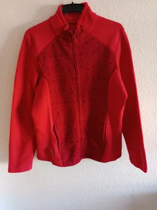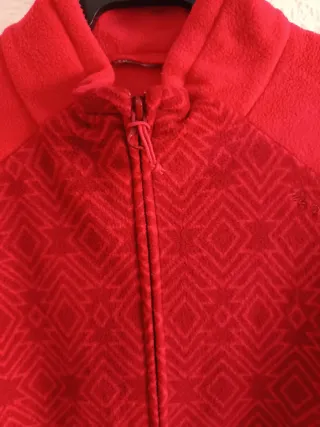Chaqueta polar de la marca Quechua en color rojo, ideal para actividades al aire libre. - Diseño con panel frontal estampado. - Cremallera completa. - Bolsillos laterales con cremallera.