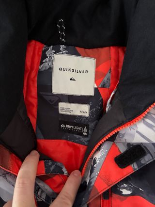 Chaqueta de nieve Quiksilver con una sola temporada. Estado como nueva - Estampado geométrico con montañas y detalles en rojo. - Cuello alto y cremallera frontal. - Bolsillos refrigeración y forfait