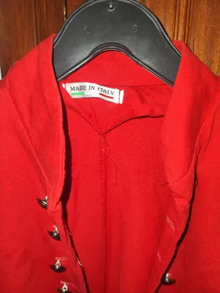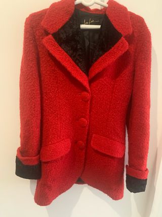 Elegante chaqueta Levita con un diseño llamativo. 90 ctm s - Color principal rojo con detalles en negro. - Textura distintiva en el tejido exterior. - Cuello solapa con forro interior negro. - Cierre de botones frontales. - Puños y bolsillos con acabado en contraste.