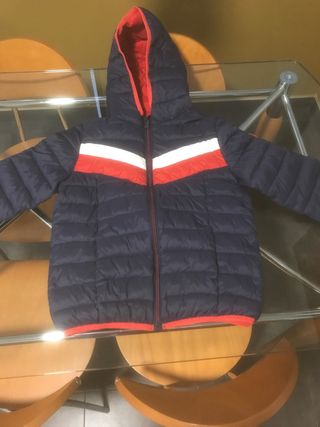 Chaqueta acolchada para niño con capucha. - Diseño con franjas blancas y rojas en el pecho. - Forro interior de color rojo. - Cierre de cremallera frontal.