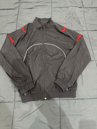 Chaqueta juvenil con un diseño moderno y detalles llamativos. tAlla XL aunque valdría también cómo L - Cuello alto con ribete rojo. - Puños y bajo con banda de rayas rojas y blancas. - Cremallera frontal. - Logos bordados en pecho, espalda y mangas. Sudadera, jersey, cazadora.